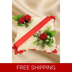A smooth  ribbon runs diagonally across the heart, offering space for a personalised name or left plain for a clean and elegant finish. The tribute is bordered with pleated ribbon in a coordinating burgundy shade, enhancing the design’s structure and presence.