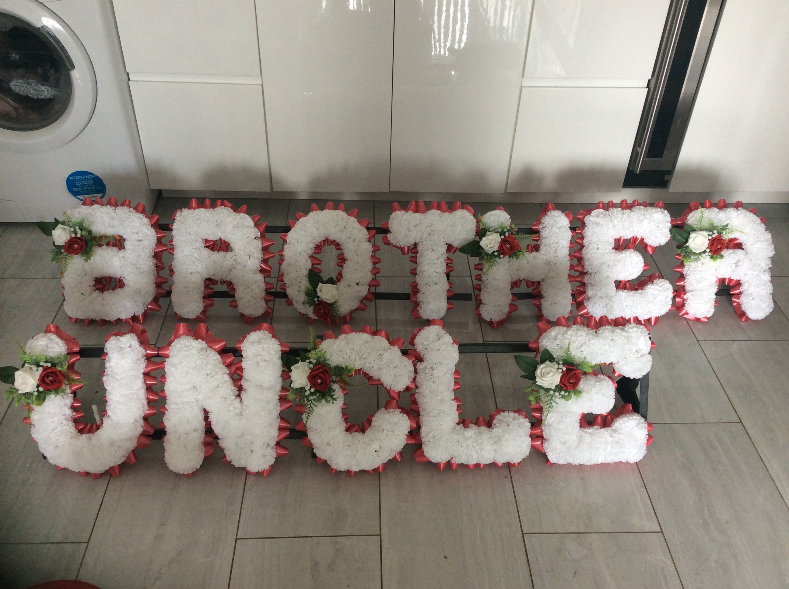 This handcrafted Uncle funeral tribute is a meaningful and lasting way to honour the memory of a much-loved uncle. Designed with care and attention to detail, this arrangement features artificial flowers, ensuring it remains a beautiful keepsake long after the service. Each tribute is arranged to showcase bold lettering that spells out “UNCLE,” bordered with ribbon edging and accented with tasteful floral sprays that reflect love and remembrance.